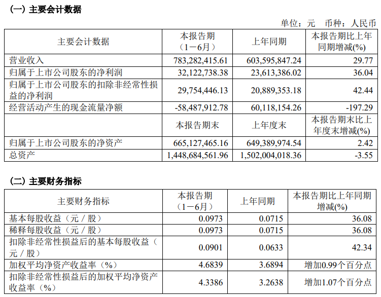 寶光股份2023年半年度主要財務(wù)指標